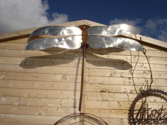 A dragonfly in rusted mild steel with stainless wings, 1.6m wingspan.