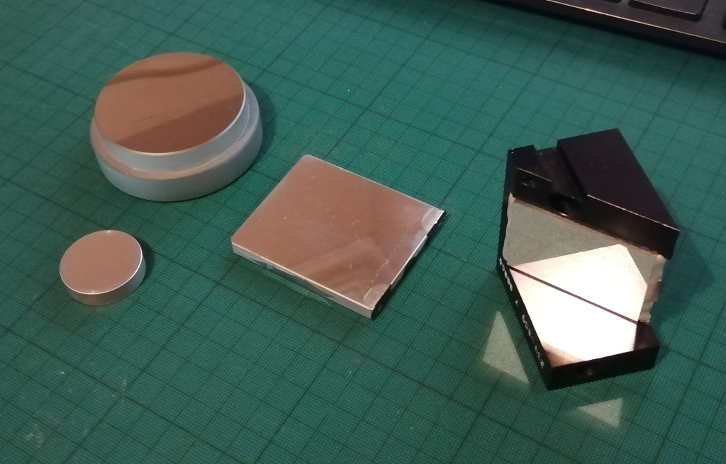 The large round one is by far the best quality but the larger rectangle one despite being scratched reflects the most light. The small one is - small and the one in the anodised housing comes from a laser scanner. It reflects well but drops off quickly over distance.