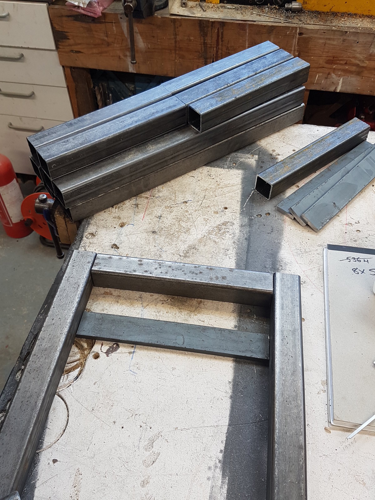 As with my previous contribution to this section, this is made with 40x40 box section. There's also a bit of flat bar and some 20x20mm angle in this one. Job one, cut all the metal... Used my Evolution saw to do this, and it makes for a far more pleasant job than using the angle grinder.