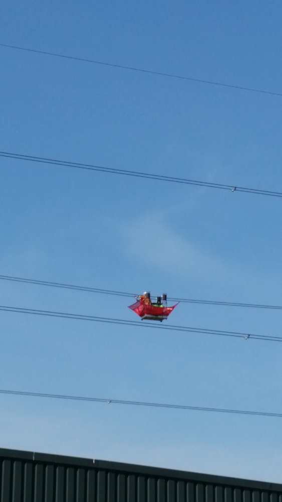 the reason it looks like a boat is is a a canvas safety sheet underneath to stop them dropping tools and the spacers which are bloody heavy even though there aluminium there big . aguy round the corner from me lives under the wires and they dropped oneThis is one of the photos I took. From further away, before I went closer to take a photo it did resemble a boat.