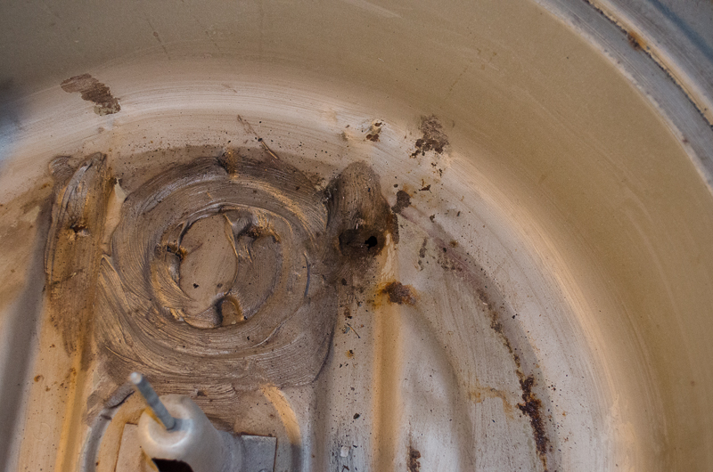 Sound proofing game off easily with help of heat gun.Rust cut off and surface rust on cavity part cleaned with wirewheel and treated with leftovers from old rust converter, primed and spayed with cavity wax after repair.