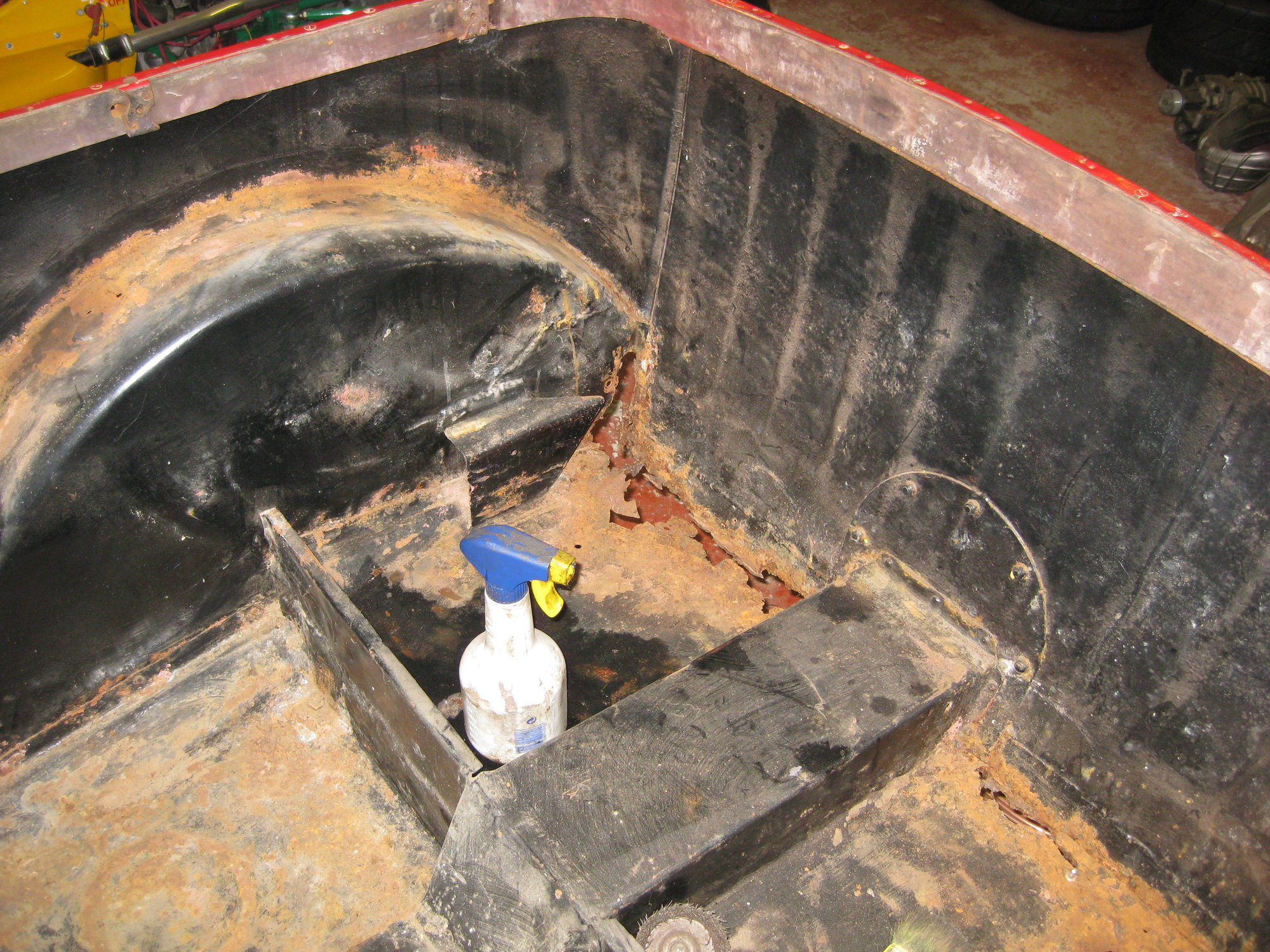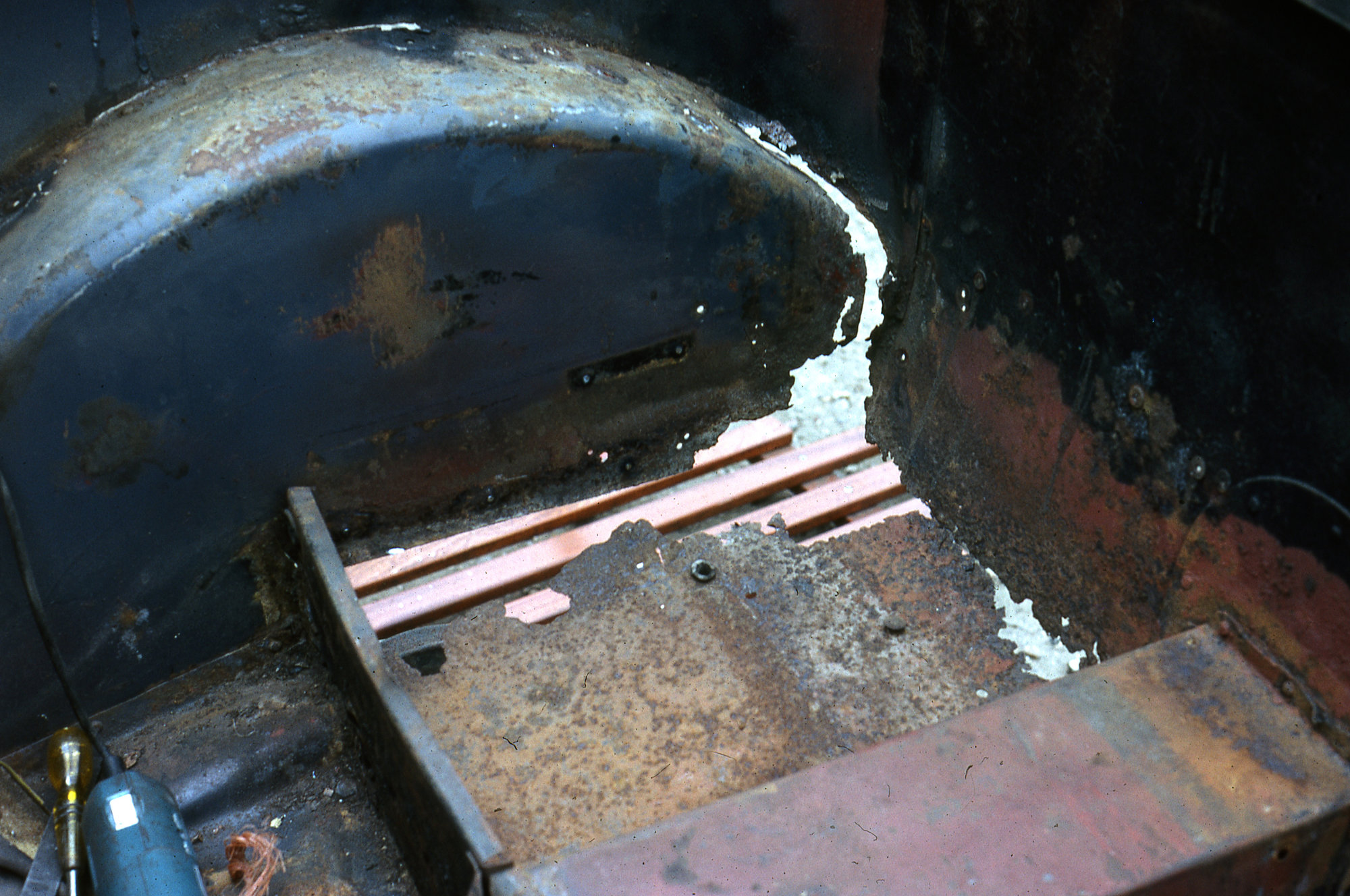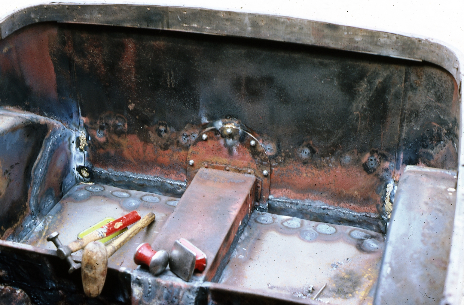 I don't have a religion on this as I posted earlier in this thread; but if you need to re-visit some previous repair work, you might be glad you seam welded the job. The rear floor of my 1931 Austin Tourer when I bought it in 1978.