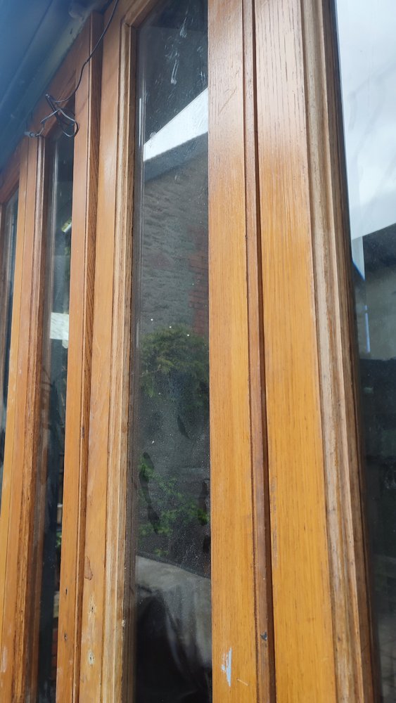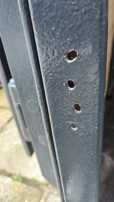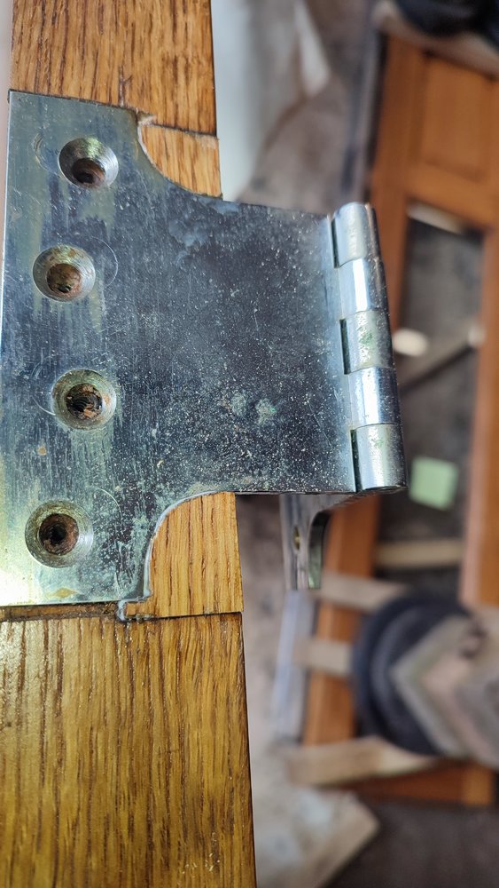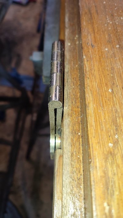 Let it dry then cut off any protruding wood, drill new holes and fit the hinges.
