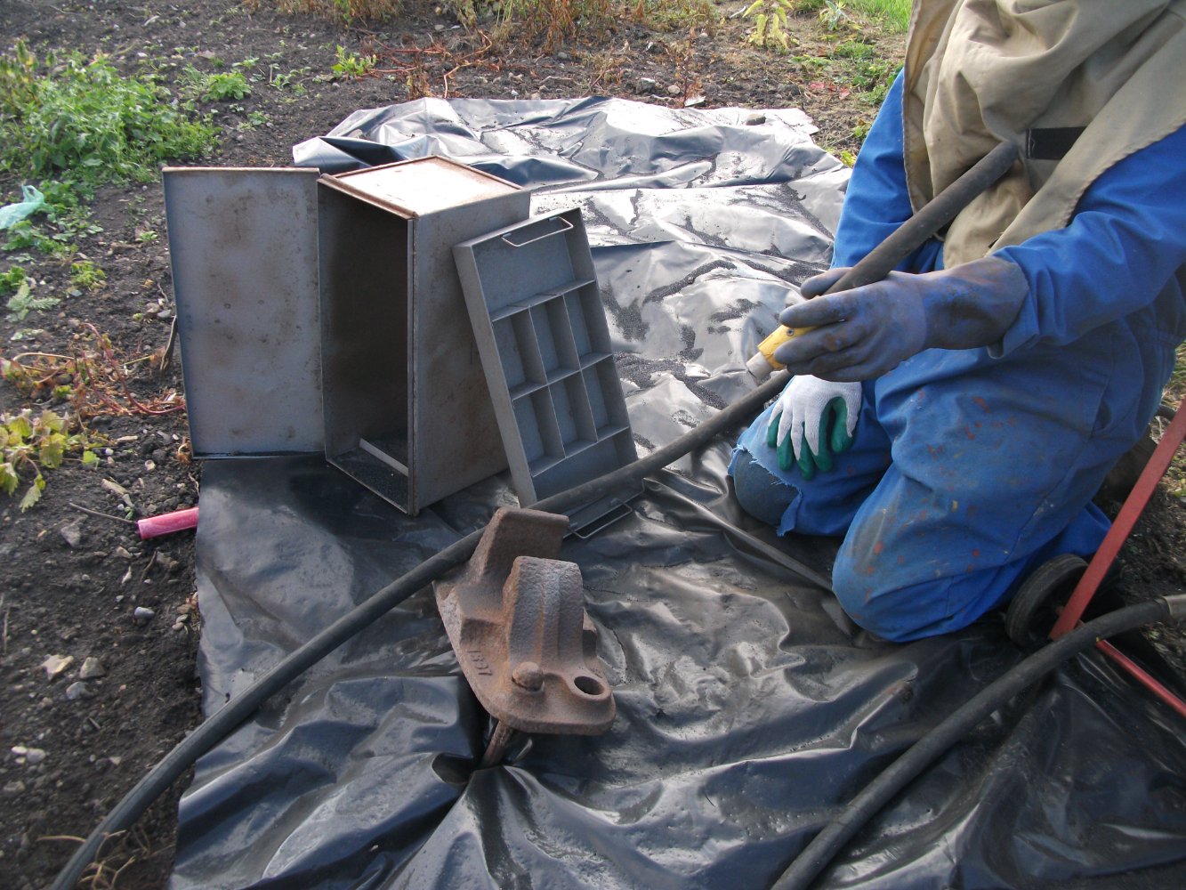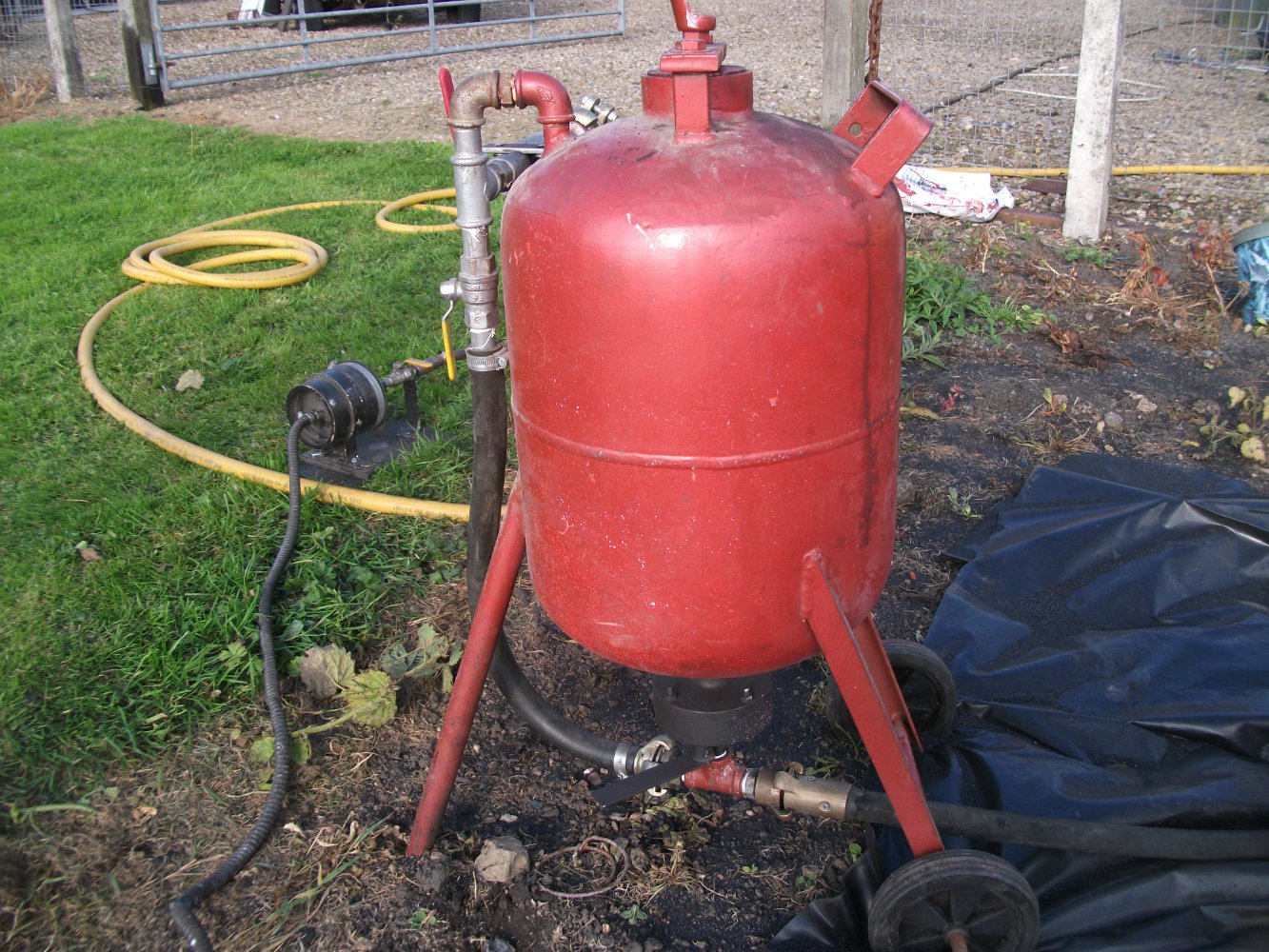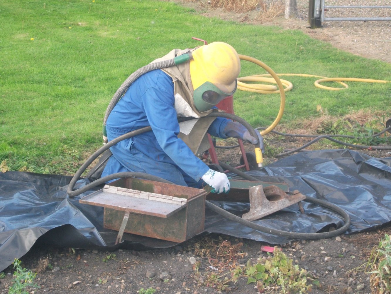 I figure a few pavers to lift it up, or even sit it on bricks and scaffold boards, and some dpm on the floor, and "Henry" can probably suck up the blast media for reuse. I may even be able to just assemble the whole thing inside somewhere. Put a bouncy castle blower in the roof ducted to outside for dust removal. I would wear air fed breathing kit whilst working.