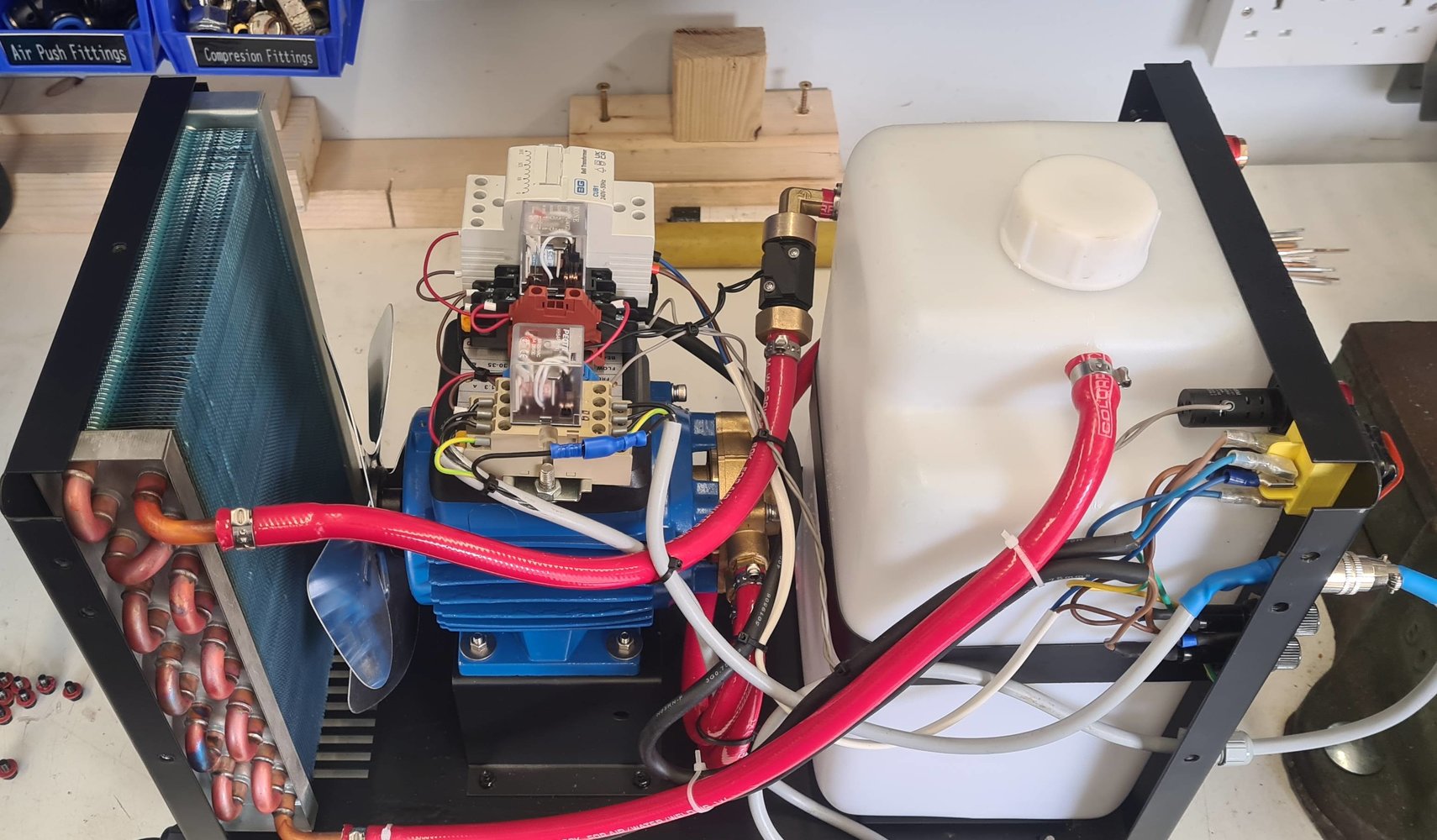 And a photo of the bits that I added for the flow alarm and a trigger switch / foot pedal 'interlock' with the messy wiring to make it all work.