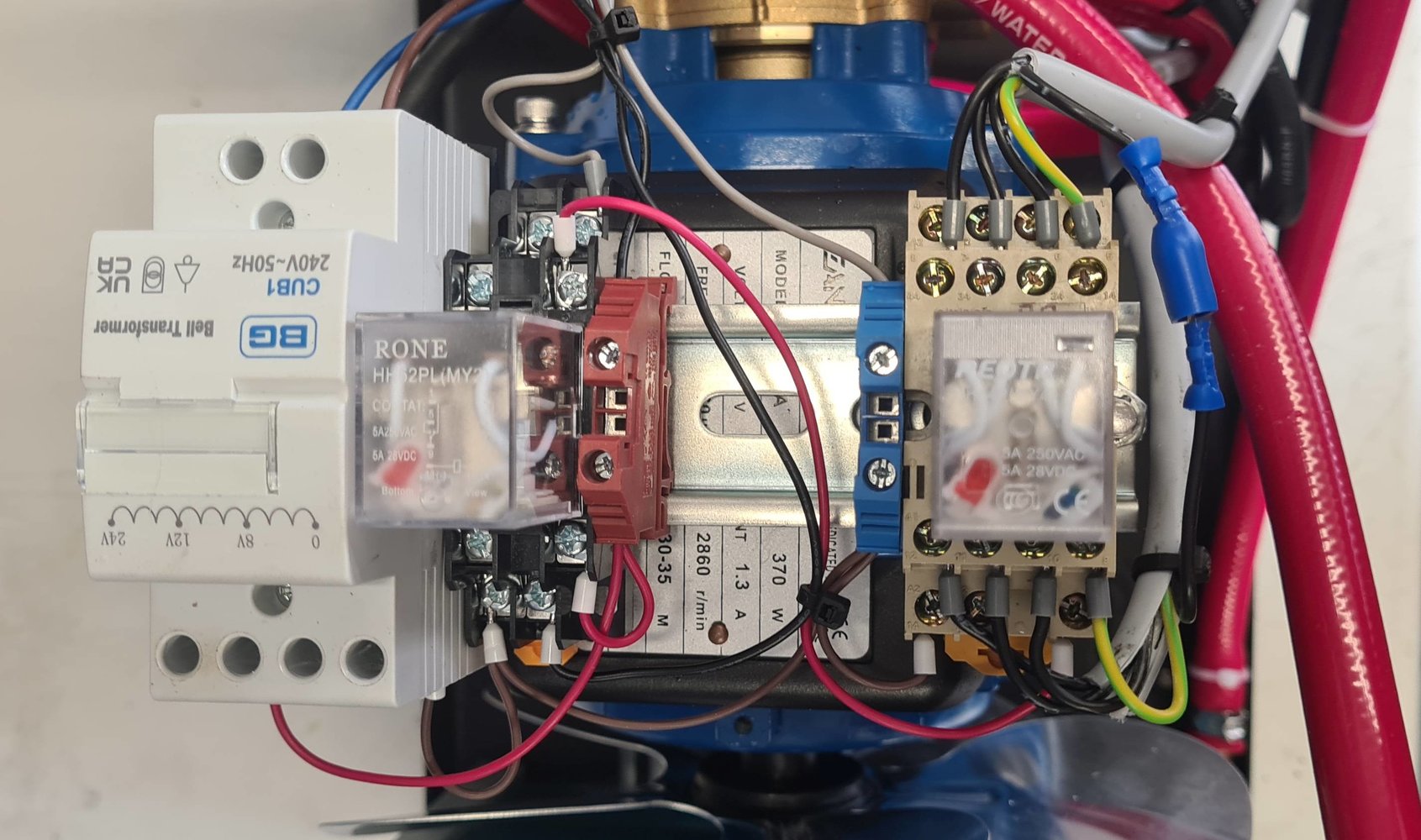 I added the transformer and relays on the DIN rail bolted to the motor top, and the flow sensor ... which has the right angle brass fitting in the top hose going around the tank.