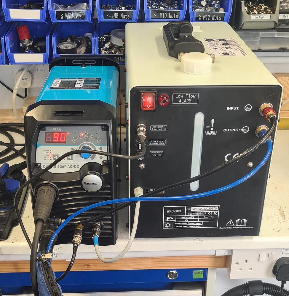 The low flow alarm sounder next to the main switch, the tig switch / pedal socket, 2 fuse holders and the pass through cable to the welders switch socket are the bits i added.