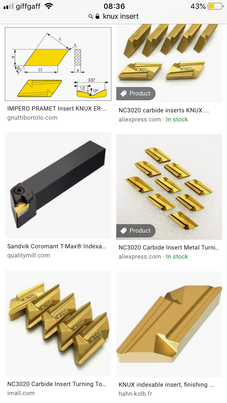 My favourite carbide of all time is the positive rake knux insert. Good finish and plenty of clearance, good on stainless too.