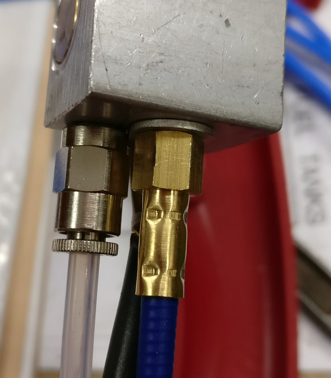 I also use full sized gas cylinders, so use an airbrush recoil hose to connect it, they are easy to undo by hand and seal well due to using O rings in the end fitting and use standard 1/8bsp threads.