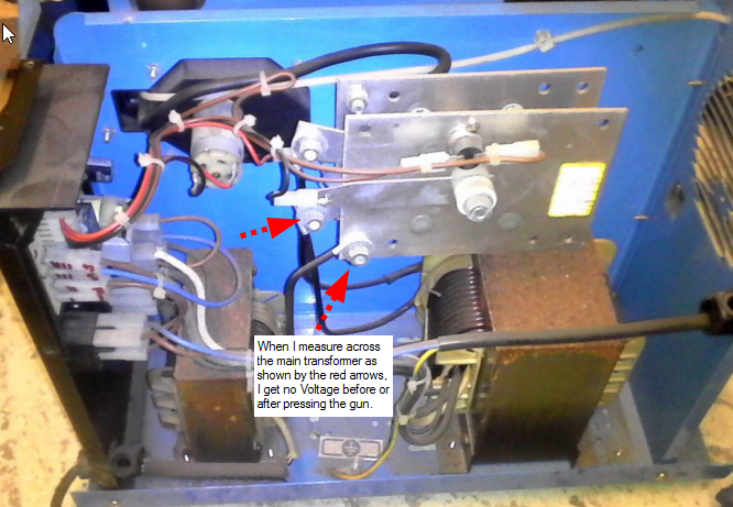 you shouldn't be getting a reading between the earth clamp and tip of the torch unless you pull the triggerThe output of the rectifier was 21 to 22 VDC. The Voltage across the terminals of the smaller transformer was about 21 to 22 VDC and also obviously at the gun tip and earth clamp, however when I pulled the trigger the volts go down to 15VDC.