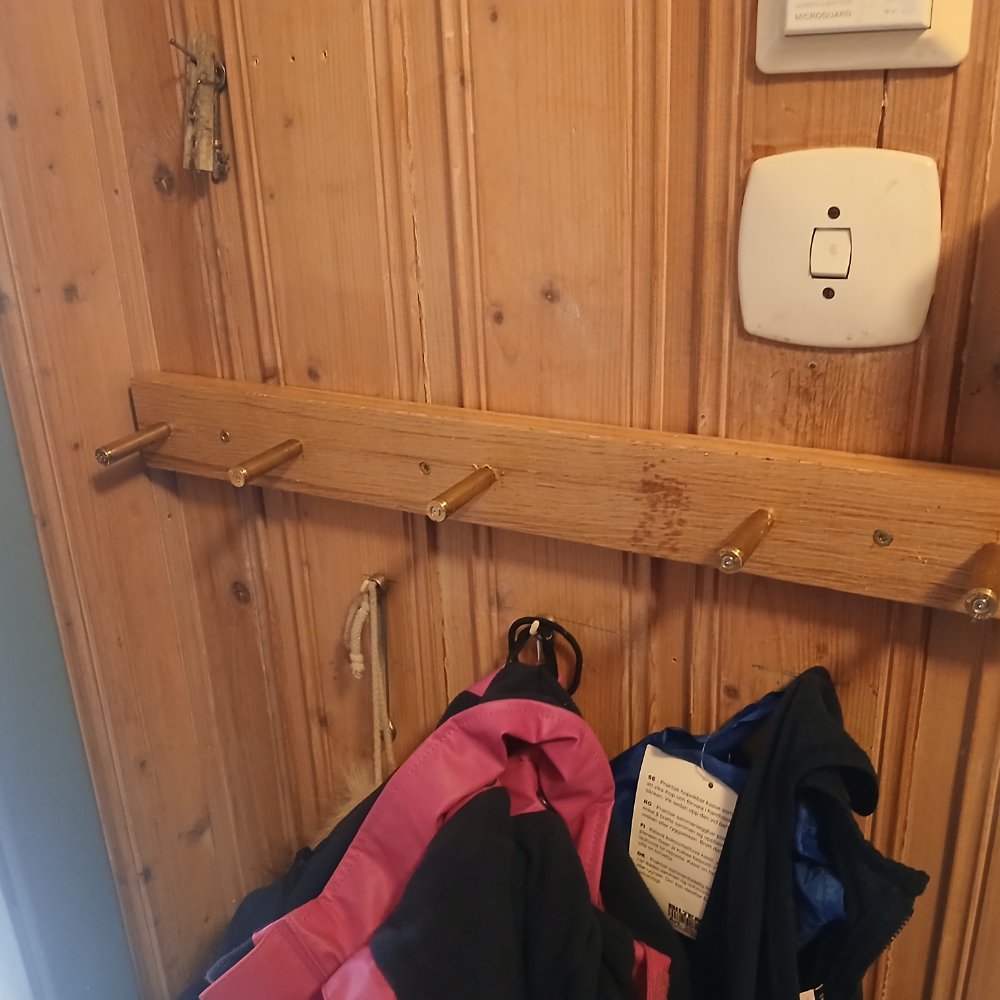 screwed into the wall. I didnt have any hooks but did have a few 3006 cases and a bit of Oak. It was a nice easy project that she could use the drill press,do some sanding and tap the cases into the holes she had drilled.