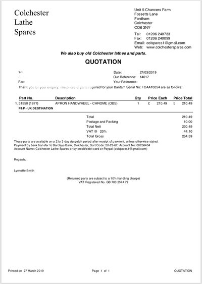mine currently has the changewheel info on it, only one more to go (and it’s not really necessary unless cutting imperial acme).@Dieselkid 63 I notice that quote covers postage to the UK, did you ask for NZ carriage?