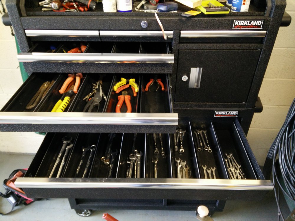 I looked at that cabinet in the Hayes branch and the stainless bench type, both seem quite nicely made. Only thing that I wasn't keen on is the draw catches tucked under the handle would drive me mad until used to them and the black crackle finish seems odd for a toolbox as it attracts dirt. Nice idea with the guttering.
