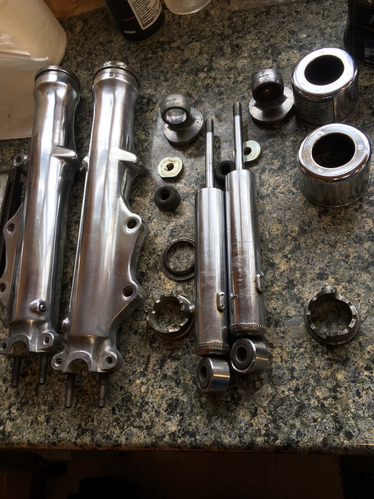 Dismantled shocks on the bench and polished fork sliders. Forks can be seen installed on bike in earlier photo.
