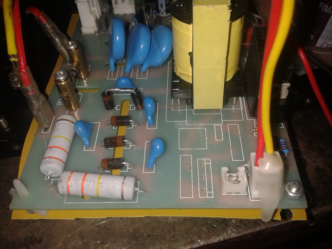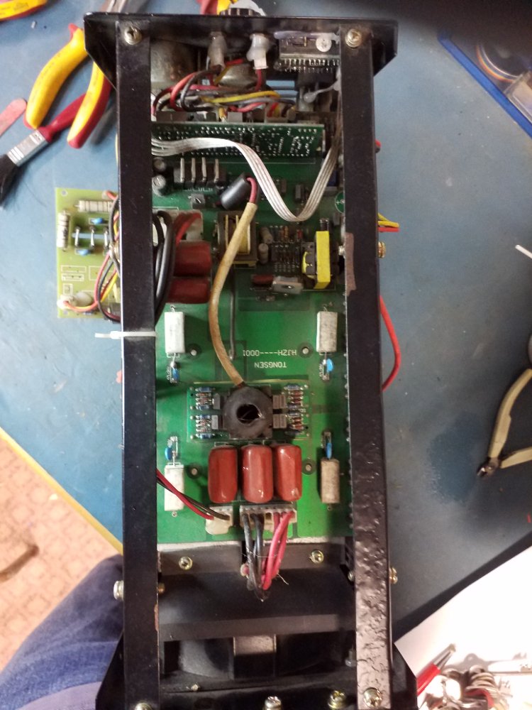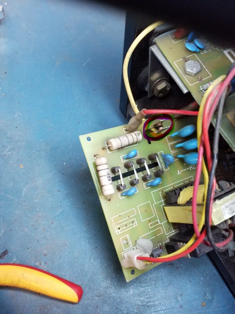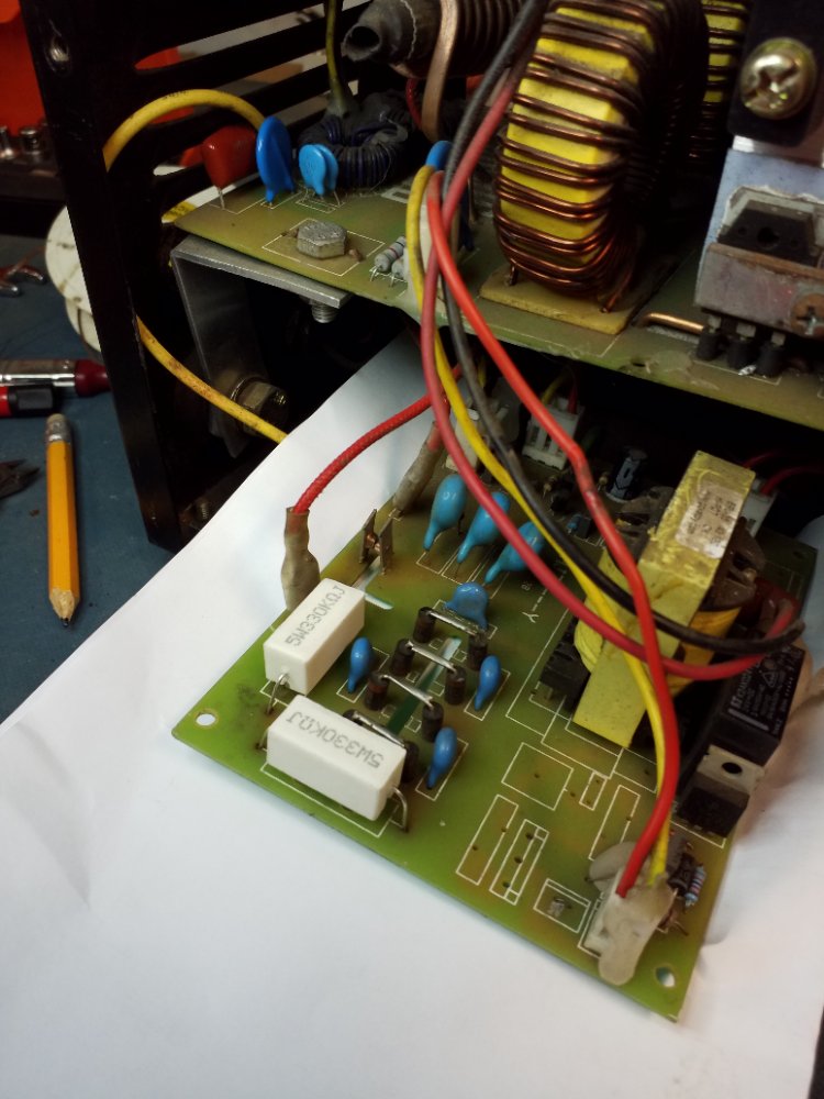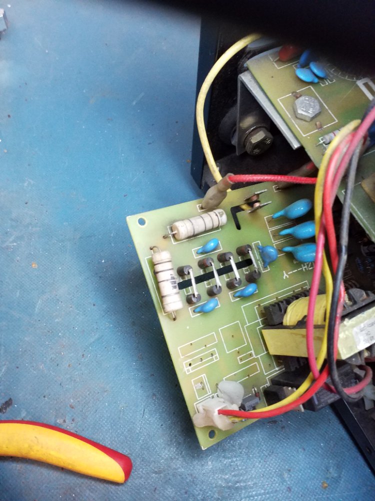 On one of the bottom boards there are two wirewound resistors, which have got very hot and discoloured, so I can't tell what value they should be. They read 340K so I'm assuming they are 330K ? The associated diodes and hv capacitors read ok, but I don't get an arc across the spark gap.