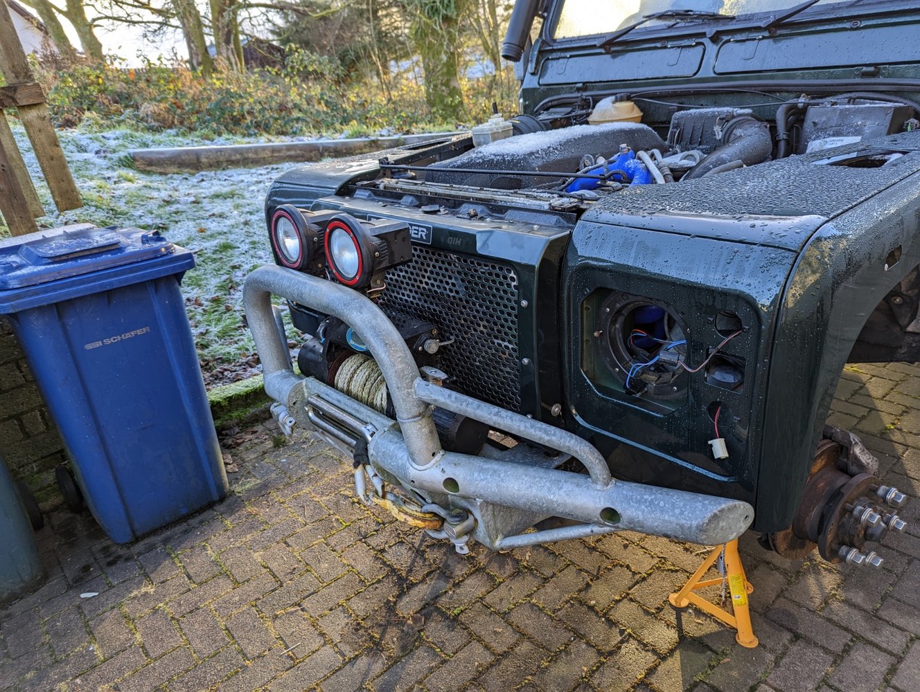 Garages are for such things, with a heater on! Your not too old, just too tight to build a bigger shed/ garage!Minus 4 this morning, car was white with frost. Took an age just to refit the parts required to get the front panel on, even had to take the winch out.