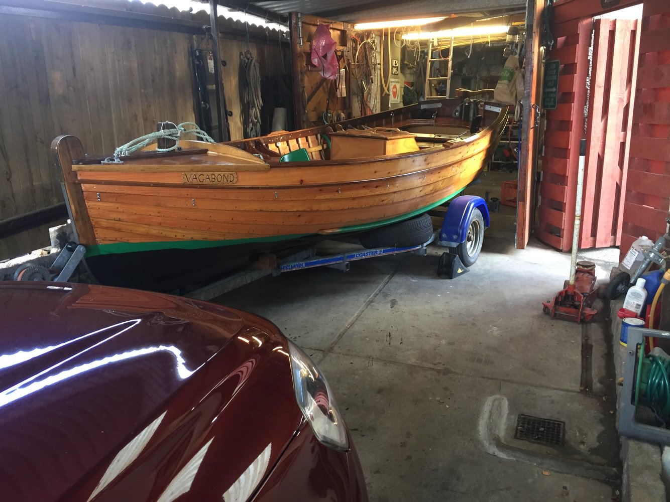 I have 8metre car port leaning onto east elevation of house. This means shelter from prevailing wind and rain. It opens into 6x4 garage and is fenced off to next neighbours. It has had Landy engines suspended across purlins. Built the boat in pic through 2 years and 2 winters. You would have needed a huge shed to do that. The timbers were 24ft long from the whole larch tree.