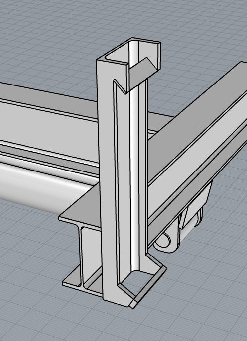 The assembly is primarily made from a 152x89 i beam and uses 125x65 u channel for the sliding push plate/skid steer attachment interface.