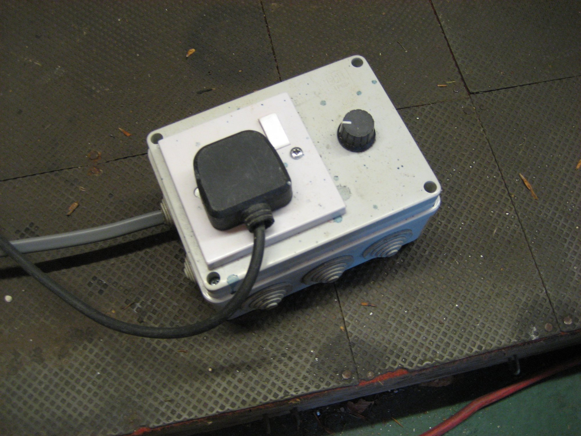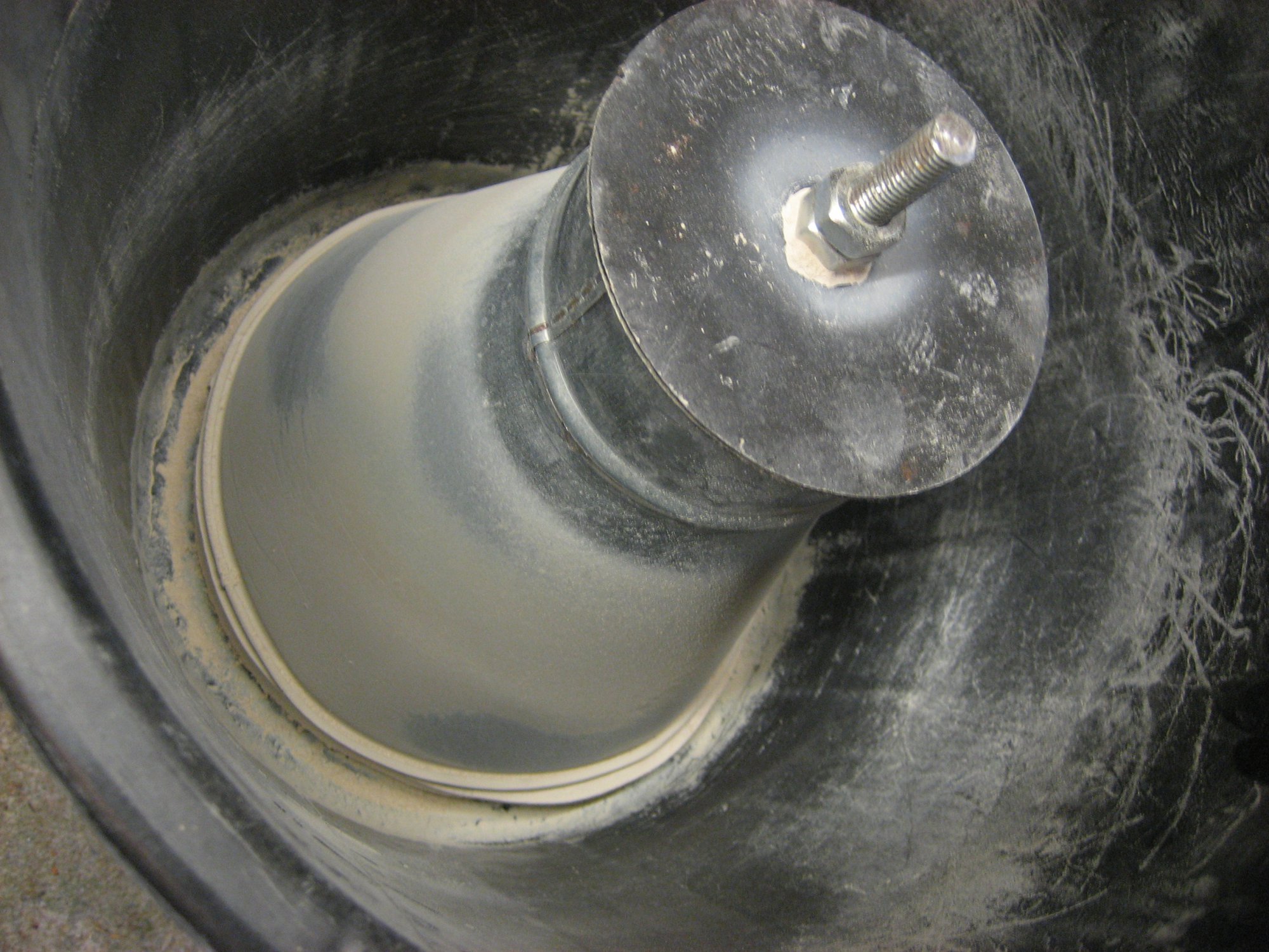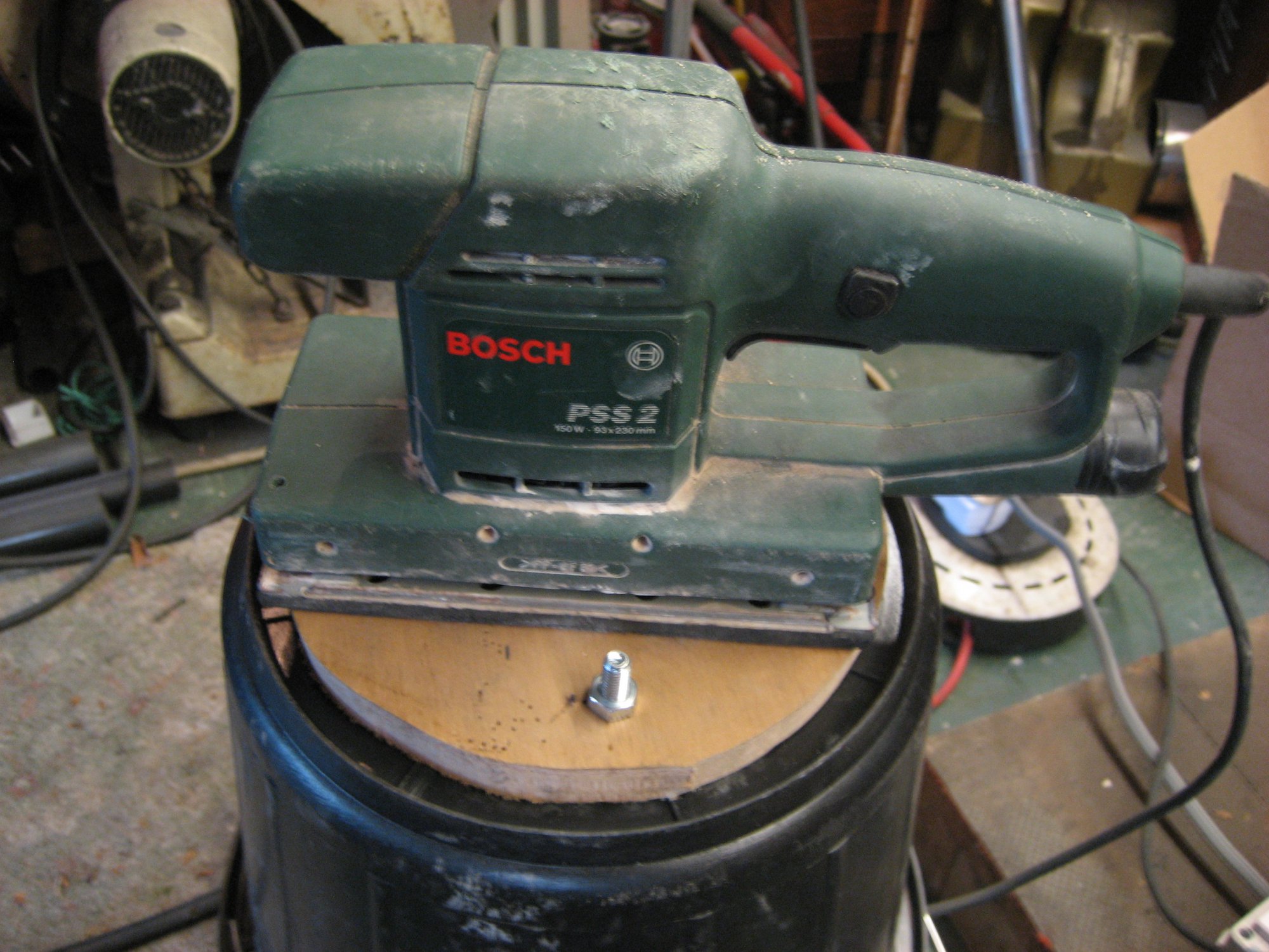 So..I bought a 3 gallon plastic bucket from toolsation for £1.80, cut out two approx 30cm circles from some 20mm ply I had lying around, drilled 4 holes in the baseplate of my trusty Bosch 1/3rd sander and made use of a big steel funnel I bought for something and never used??