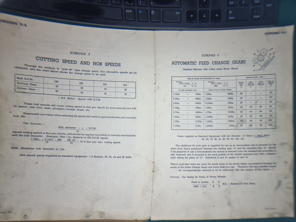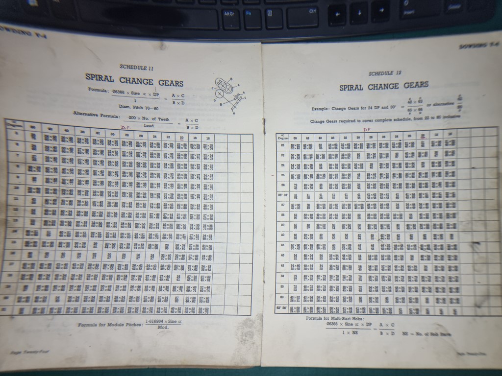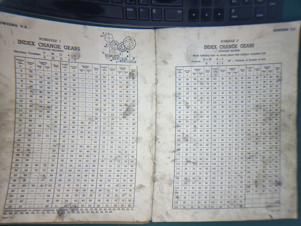 The one big advantage of this machine is that it has a 4-gear differential train which means that where the Mikron can cut only spur gears, this one can do both spur and helical gears. I'm glad I got the instruction manual for it though because there is a LOT of setup info in there that would be very hard to do without. Here's a few example pages, I'm going to have to set up a light box and scan it all in properly one day soon.