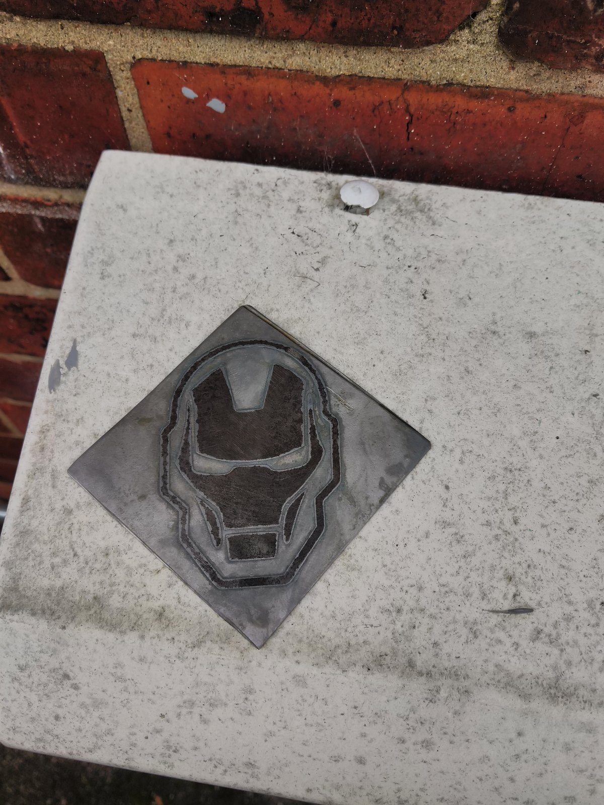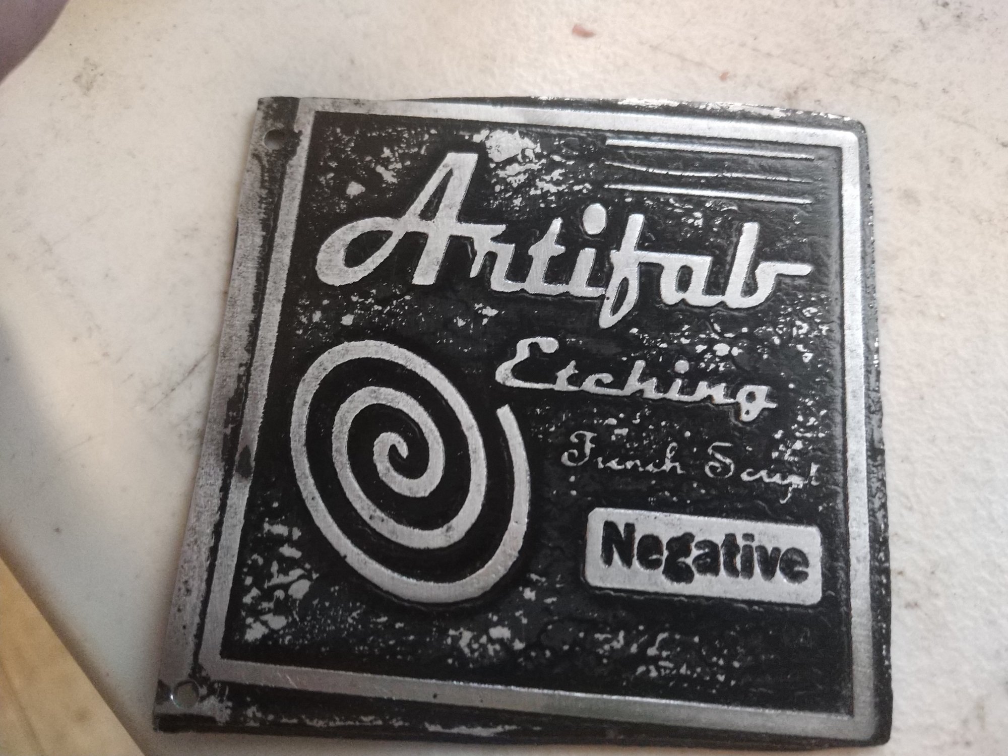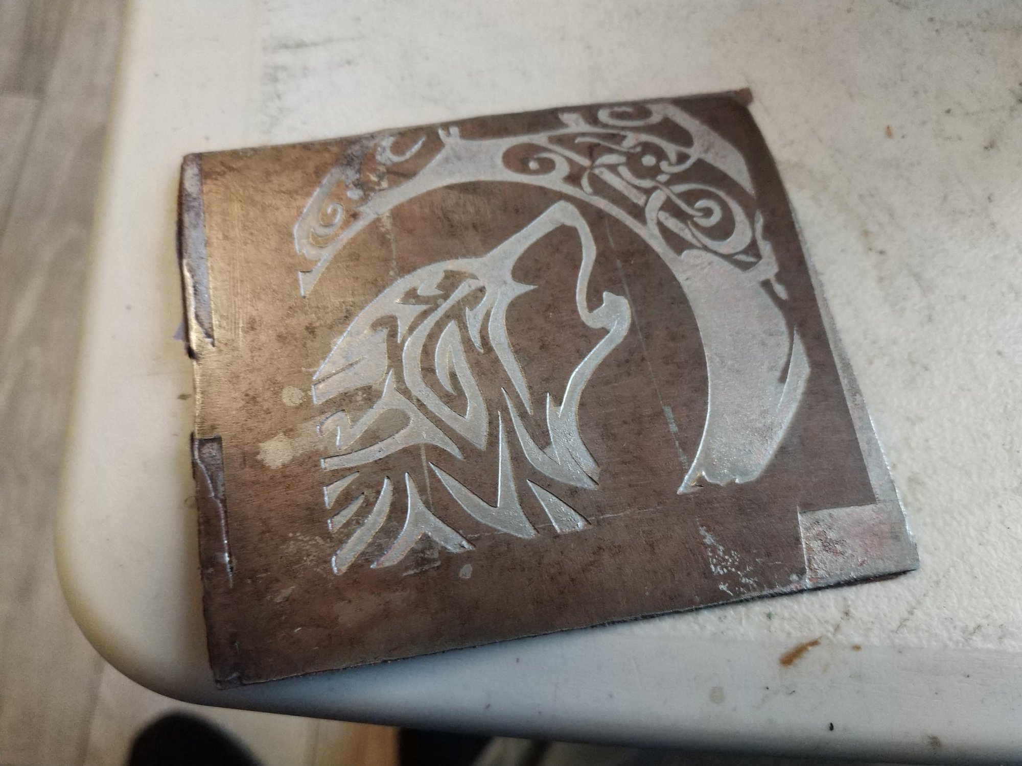 The idea is to copper plate the entire thing, then etch off the copper and 0.2mm ish of steel and nickel plate the etched parts to get a multi-tone effect.