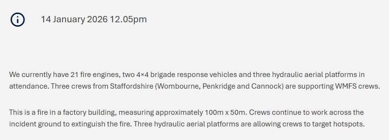 Good job it was at night. Not only do you need more resources they have a very understaffed fleet. Loads go home at midnight. ( unless they have altered the time agaon)Looks like they had half of their entire fleet of appliances there plus some help from Staffs FRS.