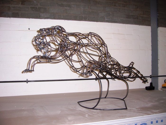 ). Anyhoo, I've made several model harleys that I'll have to find the pics of and post them. In the meantime here's a couple of animals that I've done. The jaguar was my first attempt at a life form so to speak. I cant draw worth a sh*t and its a lot easier, for me anyway, to work out mechanical shapes. I was pleased with how it turned out and was then asked to make the horse and plough. They both started as scaled up chalk outlines on the floor. Outline made up and propped up vertically at the correct height.Rod hand bent around mdf circles and basically made it up as I went along.