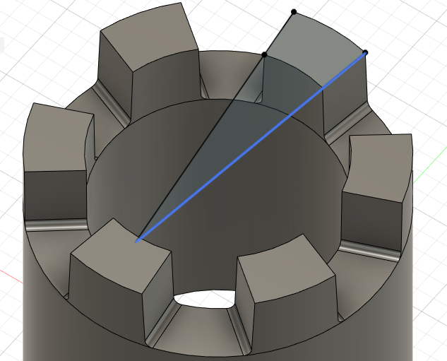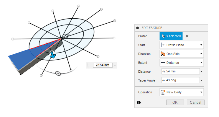 That method will taper the outer edge of the tooth too, and you have to manually calculate that taper angle.Select the segment and extrude it down and taper by the calculated taper angle (2.434 degrees) - and create a new body
