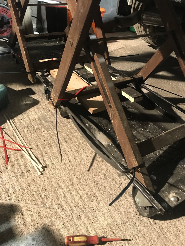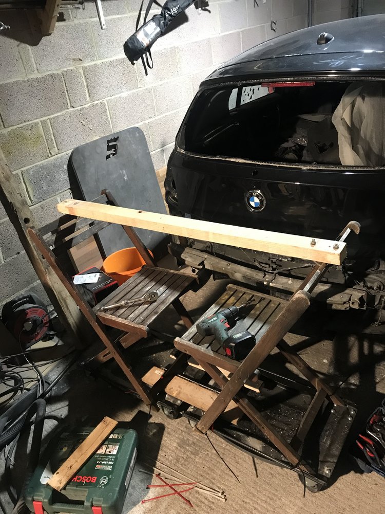 Just made up this eyesore out of various bits. Needed something I can wheel my bumper about on. Wheel it to centre of garage and spray epoxy then wheel it back to rear of garage after so I can park my rear windowless car inside my garage as well.