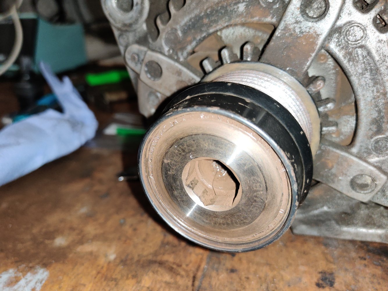 How can I remove this alternator pulley? The part number shows it's a clutch pulley, but it’s seized and no longer "clutching". It has a 17mm female hex fitting, but there's no other place to hold it for removal.