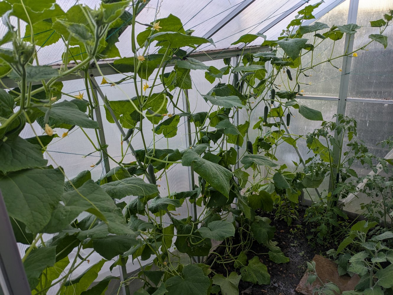 I've hung a shop cool fridge reflective curtain across the back north facing wall of the glasshouse the reflected light , heat made an amazing difference though having everything in tubs and on five 16 yr old hostess trollies on hot days & simply wheeled them outside and connected things up the auto water to a different tap pointI refuse to buy Cucumbers the rest of the year as the shop bought ones are a pale imitation of home grown ones.