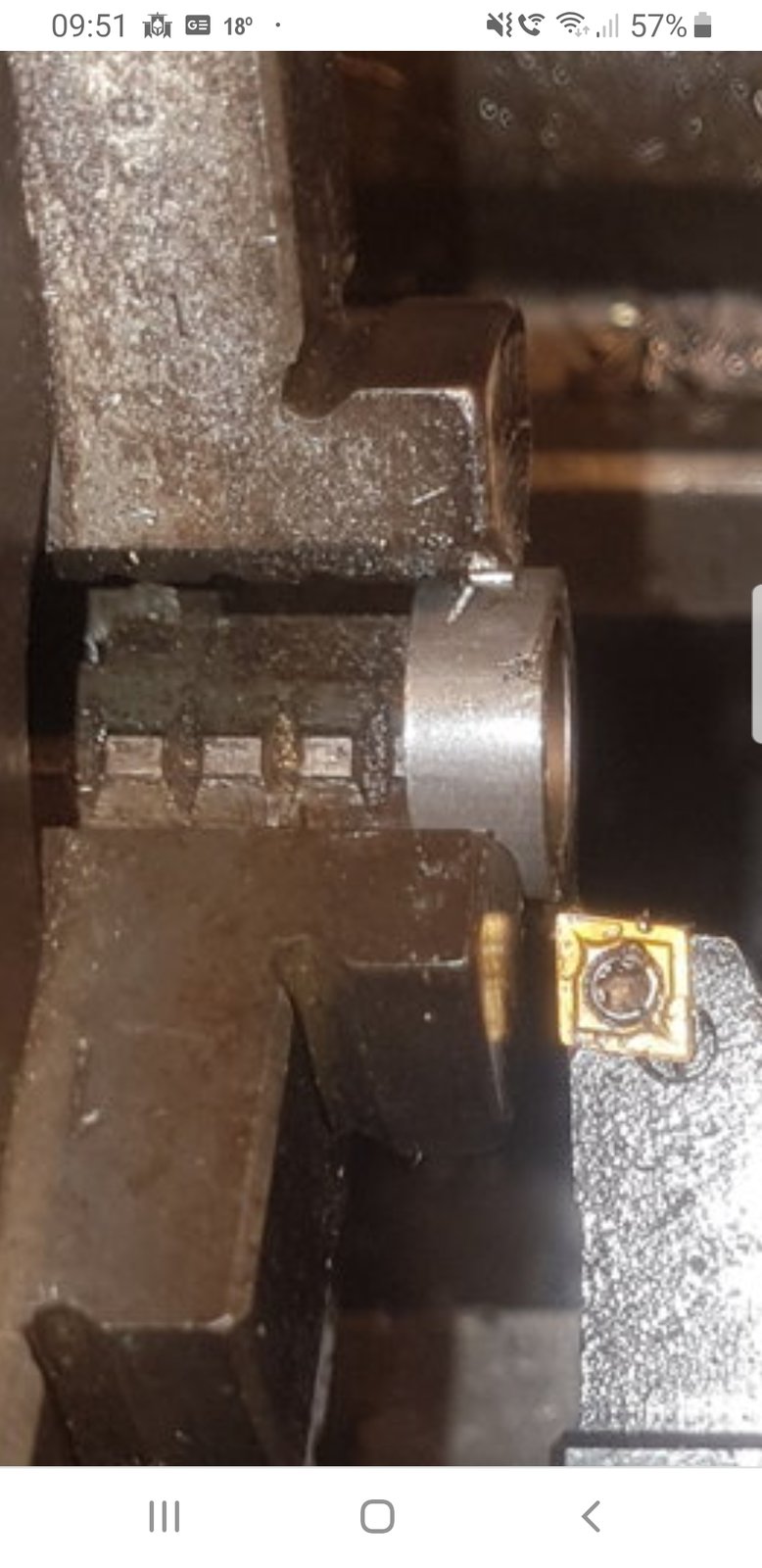 If you look at the picture. The bit your machining is very close to the edge of the jaws. If there is slight play in the jaws this will most probably cause your piece to be slightly out of round.View attachment 183215