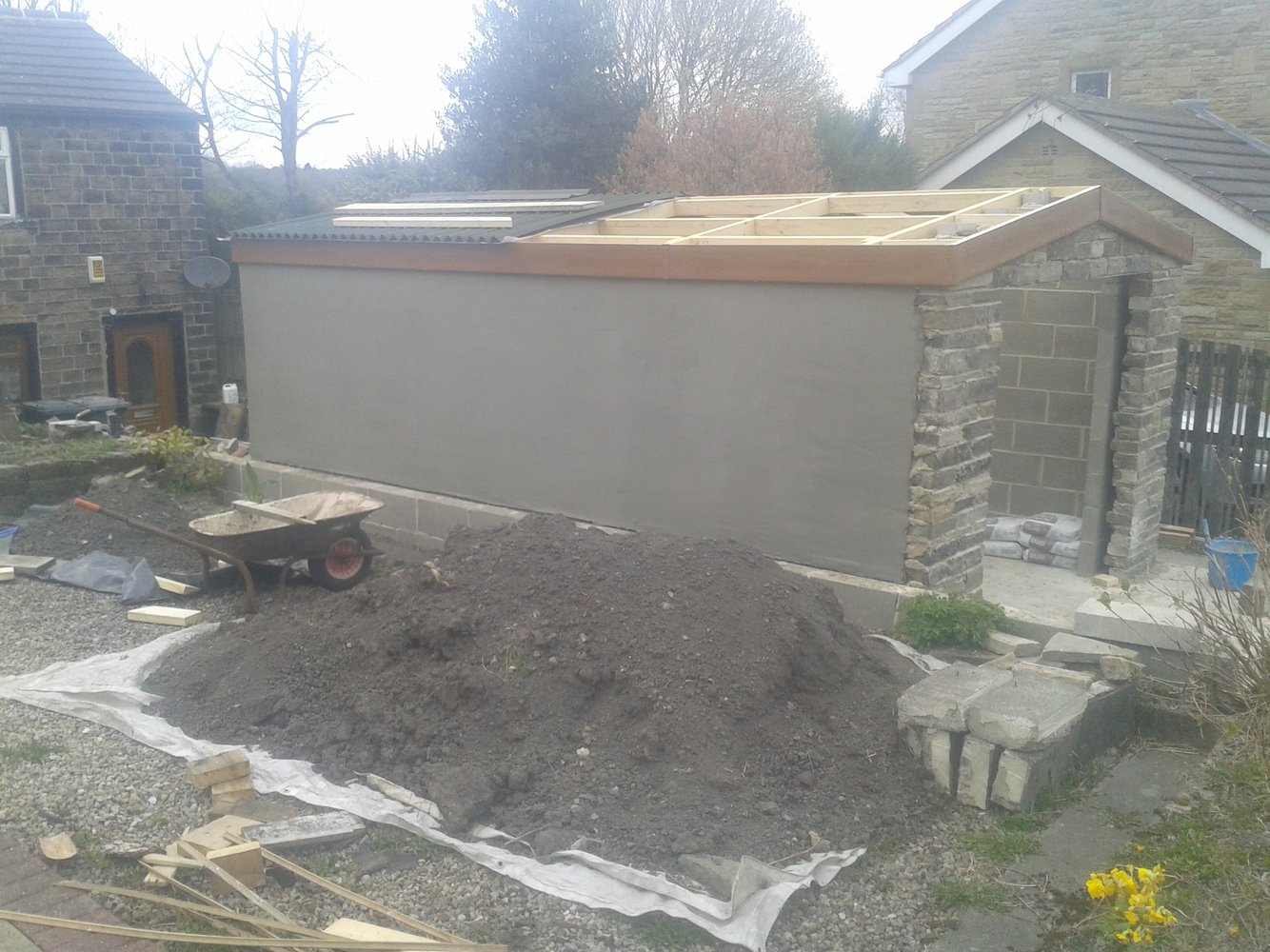 It has three evenly spaced 3x6 timbers spaced with a collar timber at each end the cross beams are on heavy galv joist hangers , that are steel strap tied in four places for three feet down the wall to prevent the wind tearing the roof off during a decent blow .