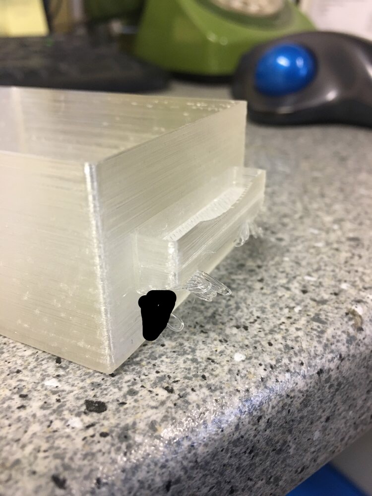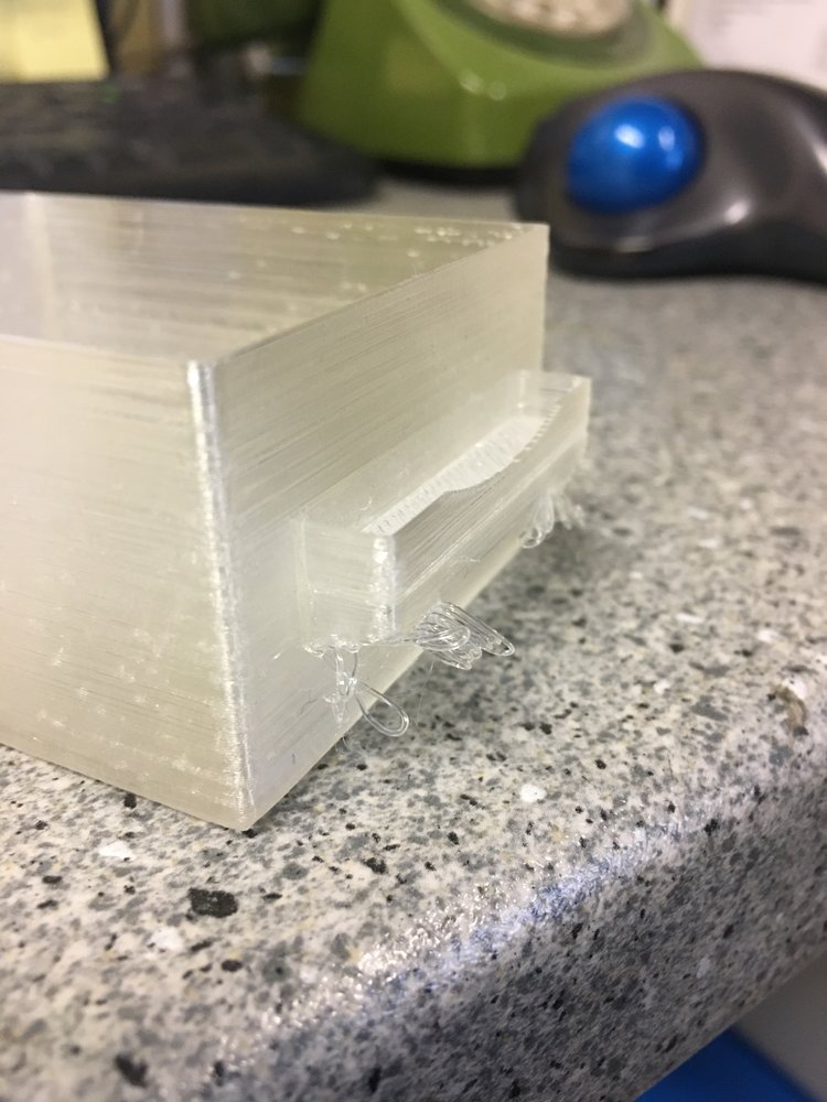For anyone who wants to print the long drawer, it WILL need support switching on. As I suspected, it couldn't print the handle in mid air, although it did better than I expected.