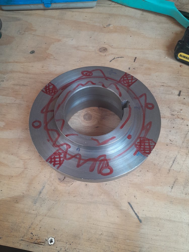 The back plate was a bit of round bar, possibly EN1A8? main flange diameter is around 5" (ignore the red marker, was sketching layouts.)