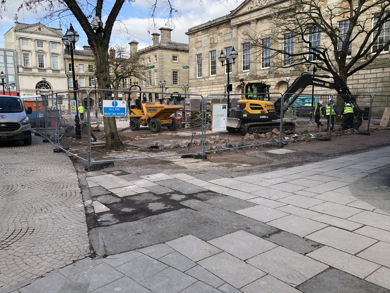 Our towns market square has been ripped up for a much needed makeover, all the old slabs were cracked, loads of cobbles missing etc. The contractors are charging over a million quid and estimate 8 months to finish the job.