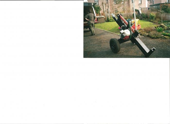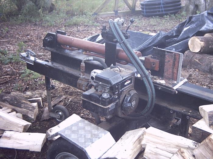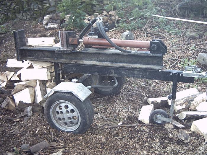 I used a ram from the backactor on a JCB,an offcut 152 X 152 beam a spool valve from a potato planter which I found when purchasing a set of rollers it was partly buried at the farm that I picked the rollers up from. I put new seals on the pistons and a set of rear hubs from a ford fiesta.The oil tank is the axle for the wheels.You can split the logs horisontaly or drop the beam and split on the vertical.A weeks cutting and splitting and stacking will give you a years burning.Forgot about the power it is run using a briggs and stratton petrol enging which has a pump attached to that bought from Northern tools in Florida the pump and attachment cost £57.00 Northern tools here do not supply the unit.