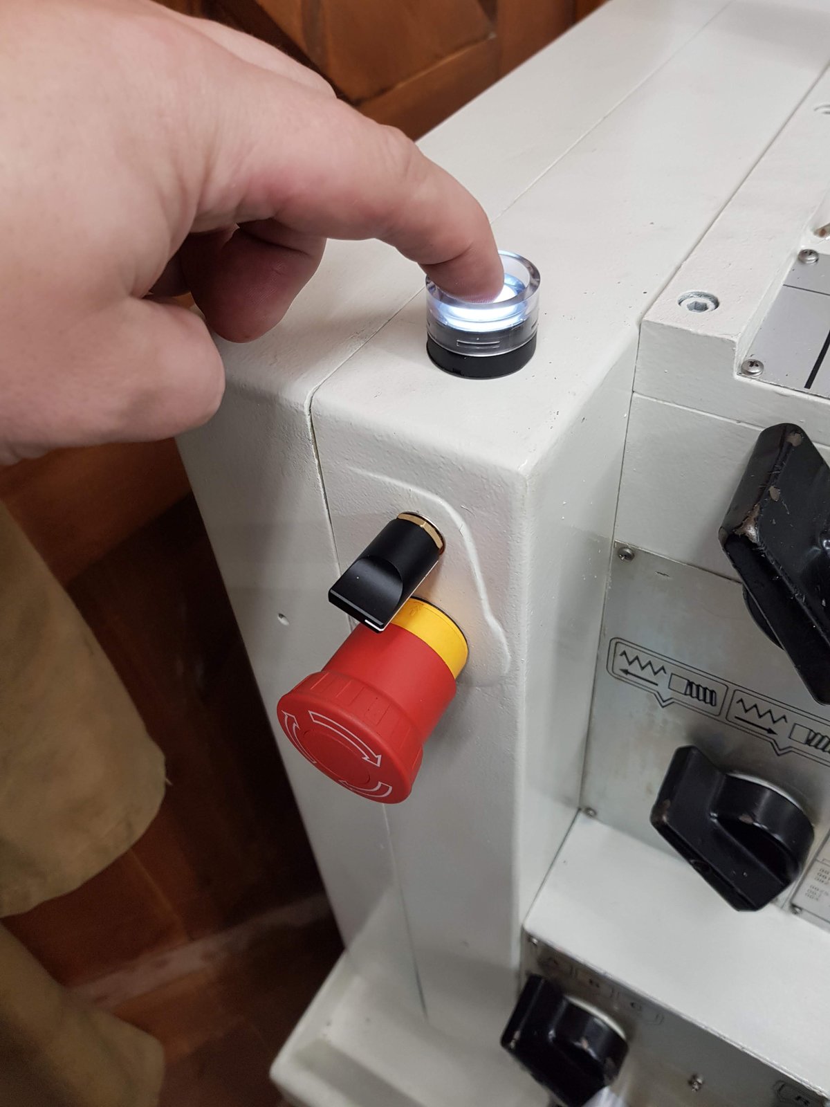 Original estop button replaced, and pot added to allow speed control of VFD. Pilot light replaced with a light/ momentary switch. The momentary switch is used to latch the contactor on to power the VFD. So if there is a power cut or you hit the estop, you have to press this button to re-energise the VFD. There is also some start protection built into the VFD. Foot brake switch is wired to the VFD to trigger a coast stop. If you hit the brake, you don’t want the VFD fighting the brake with a ramp down time.