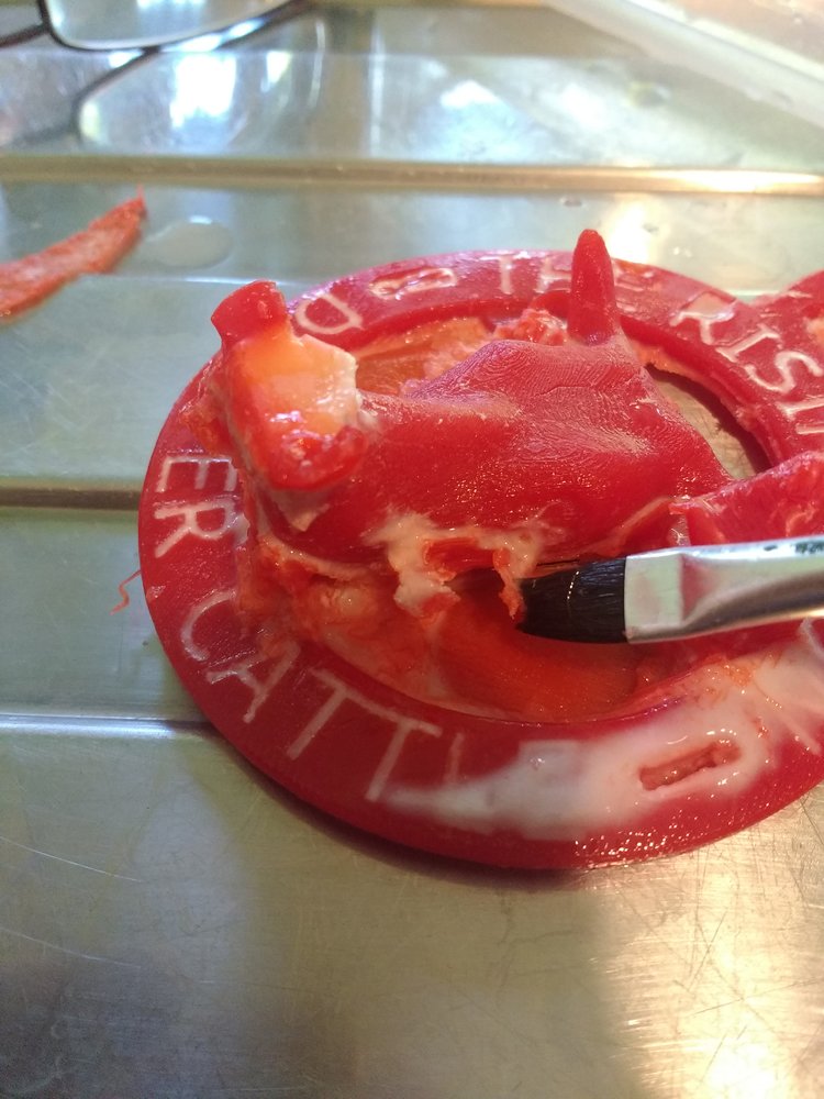 There's excess wax around the lower half of each side of the face, the left ear and snout. It maybe some bizzare wax/PLA sandwich as there is possibly a layer of PVA between the model wax and excess wax. Difficult to tell. More soaking required