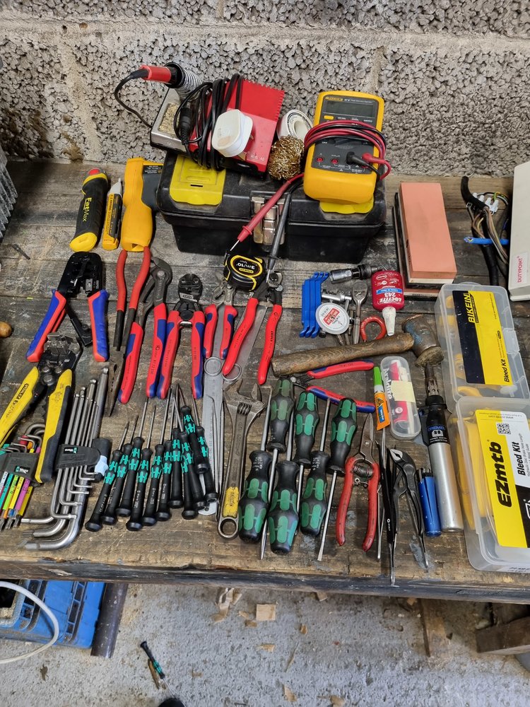 ) the tools I had at uni with me, not that it is very representative of what the average DIYer would need, or perhaps even want. This is everything I thought I'd need to do little jobs around the house, maintain my bikes and repair simple electronics, plus some things I added as and when I needed them (Plasterboard saw, RJ45 tool, etc). Nearly all of it fit in the little Stanley box with some careful packing.