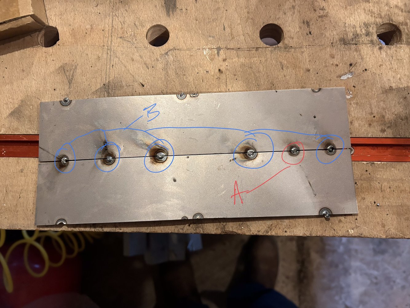 The letters represent the corresponding power setting on the machine. I’ve tried no gap, small gap large gap and messed with all the settings. Used air to cool and also tried a lump of copper as a heat sink. Any ideas?