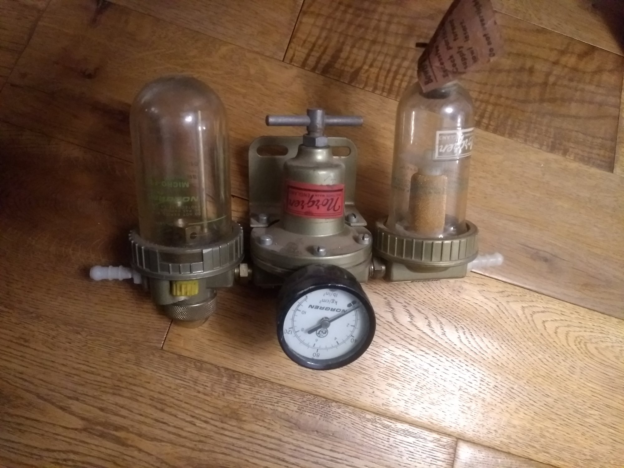 My current guess is a particle/water filter and then an oiler...I only have a filter at the moment so could come in handy. I won't be using this until I get a second air line...not going to run an in line oiler in the current hose as I need it clean for my painting.