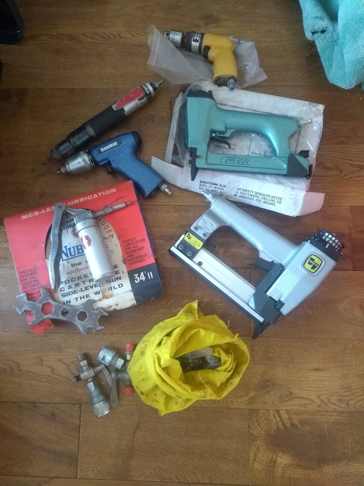 Cheers Dcal...just let me know if you find them....the gun is a Devilbiss gfg504. In addition to the pics above I got a bunch of hoses, connectors and several of the staplers and drivers. They had sold the compressor before I got there but I have my big clarke one so good on that front.