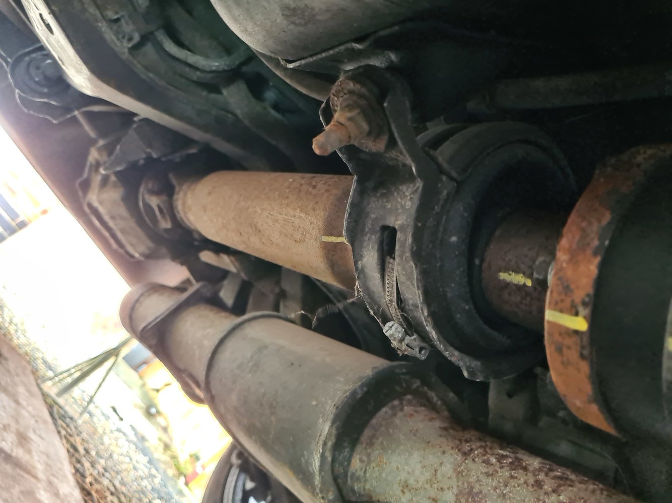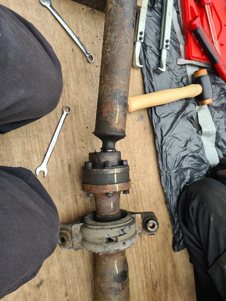 Propshaft off, flanges pressed off and bearings/ mounts replace.