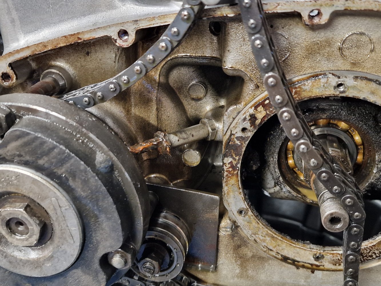 The 3TA on the ramp for clutch work and oil leak seems an odd fish. The engine code and obvious appearance make it a 1958 unit engine, but it has a 4 spring pre-unit clutch. The rally odd thing though is the primary tensioner.