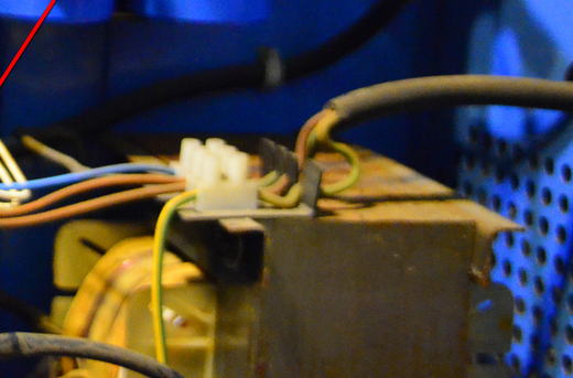 On the lower right above the transformer is where the 220/240 power comes in. The green is the ground, the other 2 are each 120 legs.