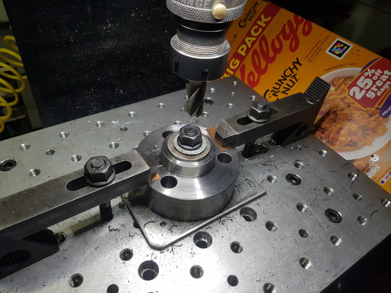 Finished machining the holes for the spindle adapter tonight , just need to work out a way to secure it now . Its a bayonet fitting on the lathe the studs and nuts pass through the nose then you rotate a ring so that you can tighten the nuts down on a narrower slot . I'm thinking of machining a pocket at the bottom of the adapter where i can slide in a U shaped washer and tighten down the nuts . Not ideal but at the moment the only way I think of.