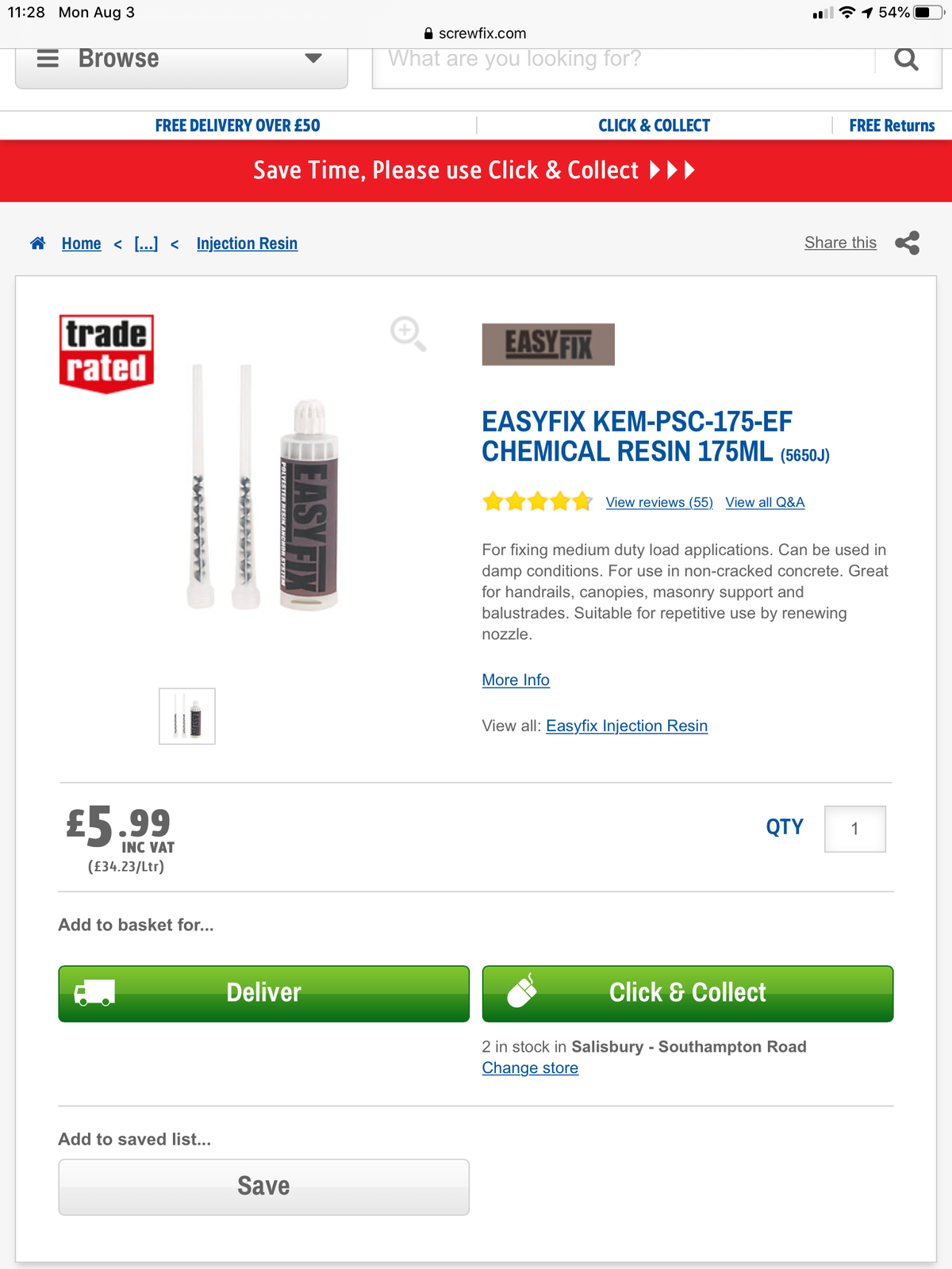 thanks for all those tips. Just to be clear as there are several ones on screwfix site -you mention easyfix so is it this particular “chemical” one below?