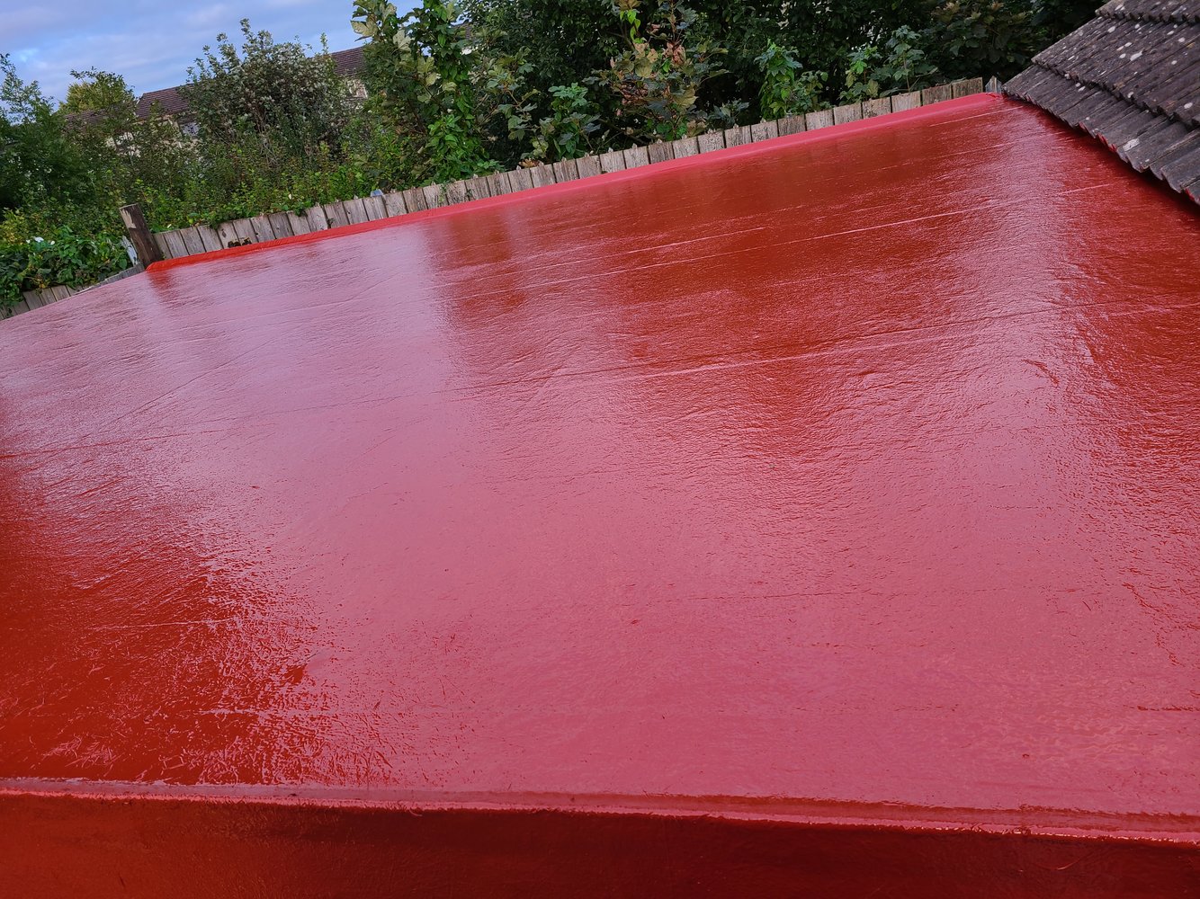Grp roof is easier to do this involved bitumen paint over the osb board, then lay bitumen backed foil, then repaint that with red base coat you lay fiberglass sheet on top the red paint soaks through, and run the roller over then 2 coats of top coat grey, it looks and feels good, sort of like painting a rubber