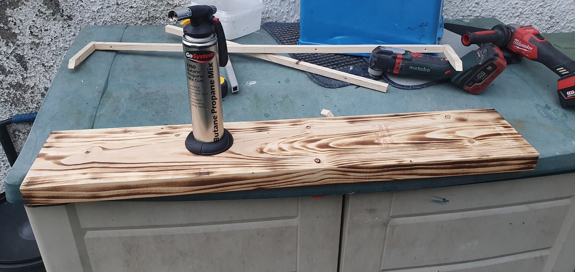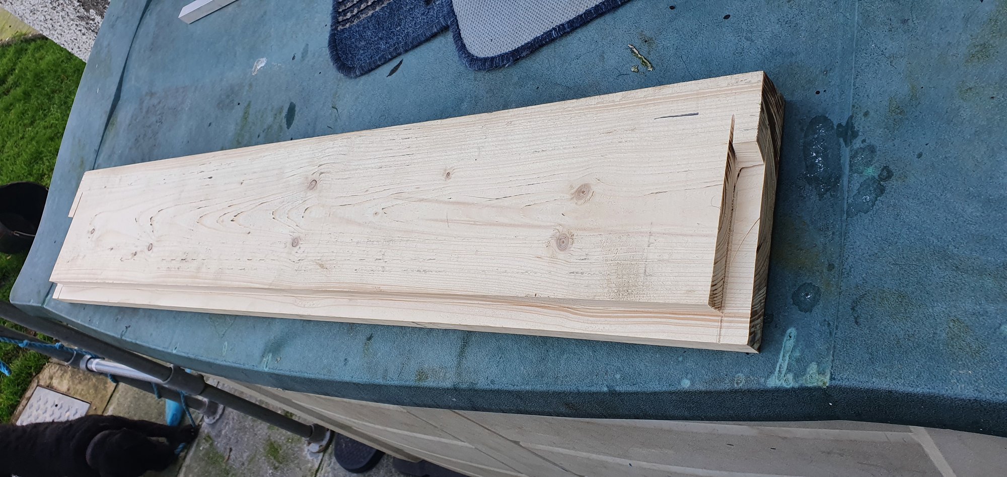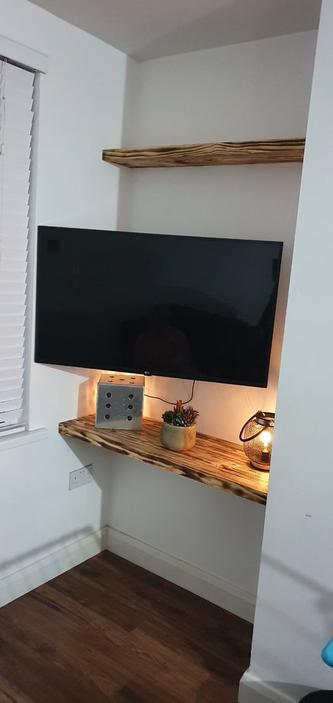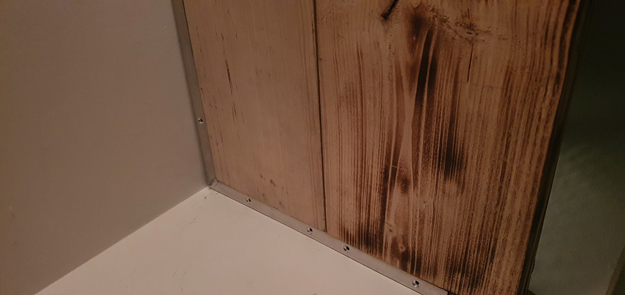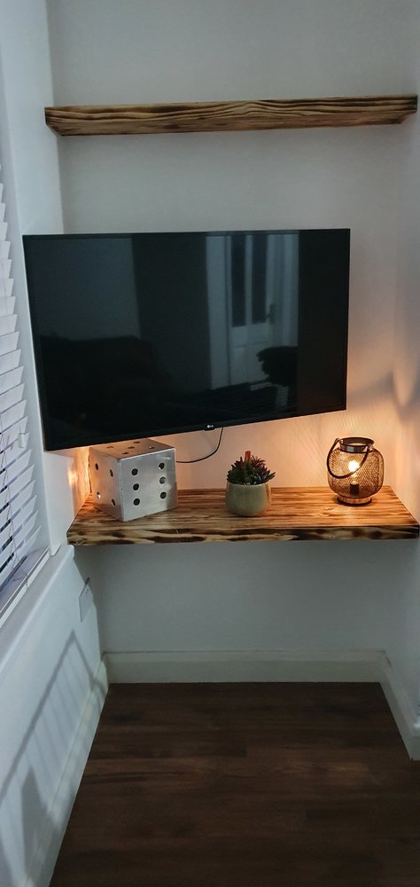 Bottom shelf 2 boards I cut a track around the outside of 20x20mm I then used 20mm aluminium box which measures 18x18 I fixed this which is a u shape and is fixed to the wall on 3 sides I've yet to fix the boards to the box as I may oil the wood you could stand on the shelf if needed, the box can't be seen unless you're lying on the floor,